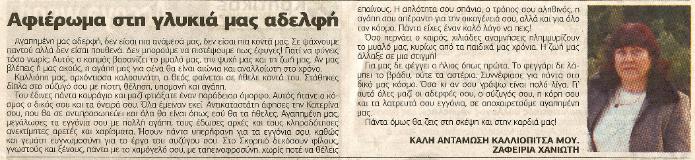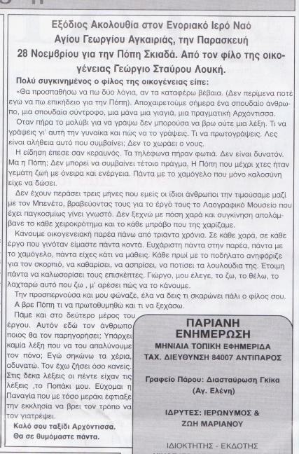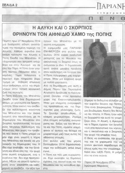 | Η όμορφη Πόπη μας, η μούσα του καλλιτέχνη, η τρυφερή σύζυγος, η λατρευτή γιαγιά και μητέρα μου, η ψυχή του μουσείου μας, έφυγε!!! 26/11/2014 Μετά από μια "καθ' όλα επιτυχημένη εγχείρηση", αφαίρεσης του θυρεoειδούς... λόγω μεταεγχειρητικής επιπλοκής και τραγικής αμέλειας των... γιατρών. Μαζί της έφυγε κι όλο το πάθος του καλλιτέχνη!!! Η Πόπη του ήταν εκείνη που ανακάλυψε την ψυχή του, το καλλιτεχνικό πνεύμα του, τα δεξιοτεχνικά χέρια του. Η Πόπη του τον παρότρυνε να εκφράσει την τέχνη του, μέσα σ' αυτό το άγονο κτήμα! Η Πόπη του πίστευε πως αν κάτι άξιζε στη ζωή ήταν να αφήνει κάποιος, φεύγοντας, κάτι όμορφο πίσω του για να τον θυμούνται. Η Πόπη του χαιρόταν σαν παιδί με το κάθε έργο του. Η Πόπη του έβαζε τον πήχη όλο ψηλότερα, αναδεικνύοντας τον καλύτερο εαυτό του. Ολα για κείνον ήταν η Πόπη του. Μόνο για εκείνη δημιουργούσε, για να της δίνει χαρά... για να εισπράττει καθημερινά την αγάπη της. Και τώρα κενό! Ενα τεράστιο, μαύρο κενό κι ένα μεγάλο γιατί... Γιατί να την χάσει τόσο νωρίς... γιατί να μείνει ο ίδιος, και τι να κάνει πια μόνος εδώ? Το μόνο που σκέφτεται πια, είναι να πάει όσο ποιο γρήγορα να την βρει... Οπου κι αν είναι... Αρκεί να είναι πάλι μαζί. Τελευταίο του έργο, ήταν το σπίτι τους όπου στέγασαν την αγάπη τους για 46 ολόκληρα χρόνια, τόσο λίγα γι αυτόν! Μα η Πόπη του δεν πρόλαβε να το δει! Το μόνο που μας απέμεινε πια, είναι λίγο κουράγιο, για να κρατήσουμε το μουσείο της ανοιχτό, καταπράσινο όπως κάθε πρώτη του Μάη συνήθιζε και να την μνημονεύουμε μέσα από το όμορφο έργο της. |